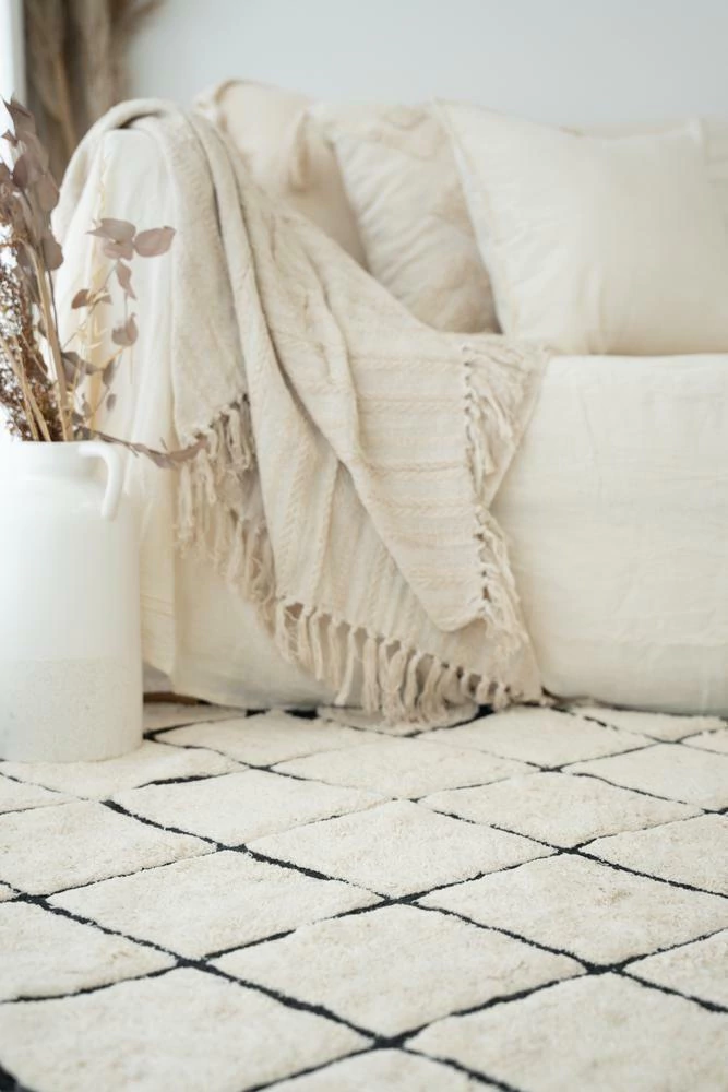 Renueva tu hogar con la Alfombra Dindori, una pieza única que combina diseño y textura. Su patrón de rombos en relieve y confección en algodón la hacen ideal para crear ambientes cálidos y sofisticados con un toque boho chic.