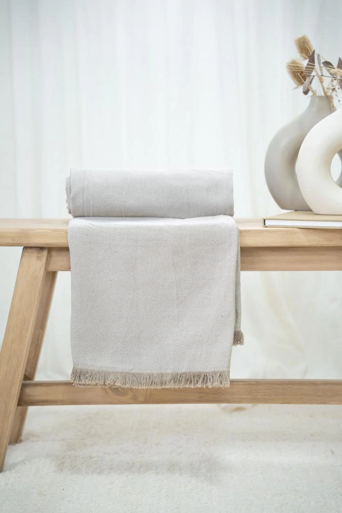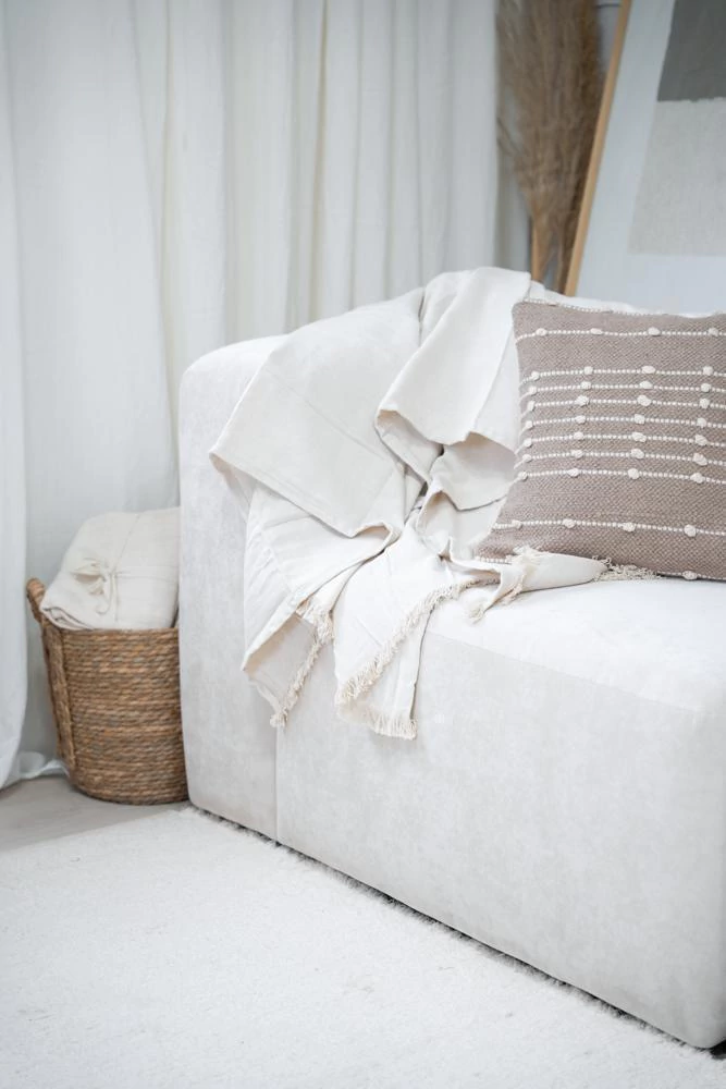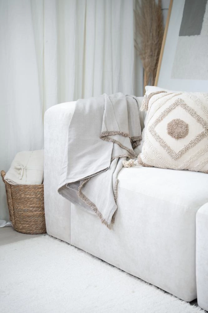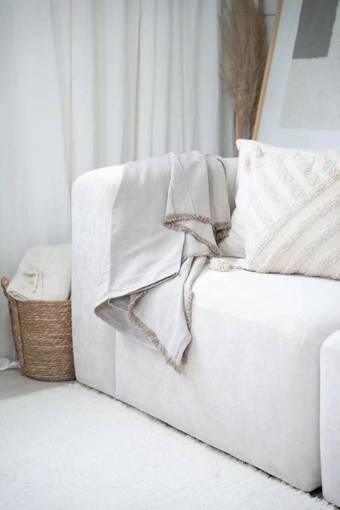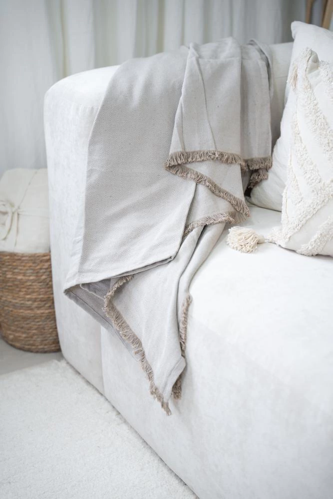 Nuestra manta ALMORA está confeccionada artesanalmente en 100% algodón natural, importada directamente de la India, cuna de las técnicas textiles más antiguas del mundo. Su diseño rústico en tonos neutros combina con cualquier estilo de decoración: boho, minimalista, nórdico o clásico.