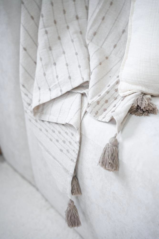 Nuestra manta NAINI está confeccionada artesanalmente en 100% algodón natural, importada directamente de la India, cuna de las técnicas textiles más antiguas del mundo. Su diseño rústico en tonos neutros combina con cualquier estilo de decoración: boho, minimalista, nórdico o clásico.