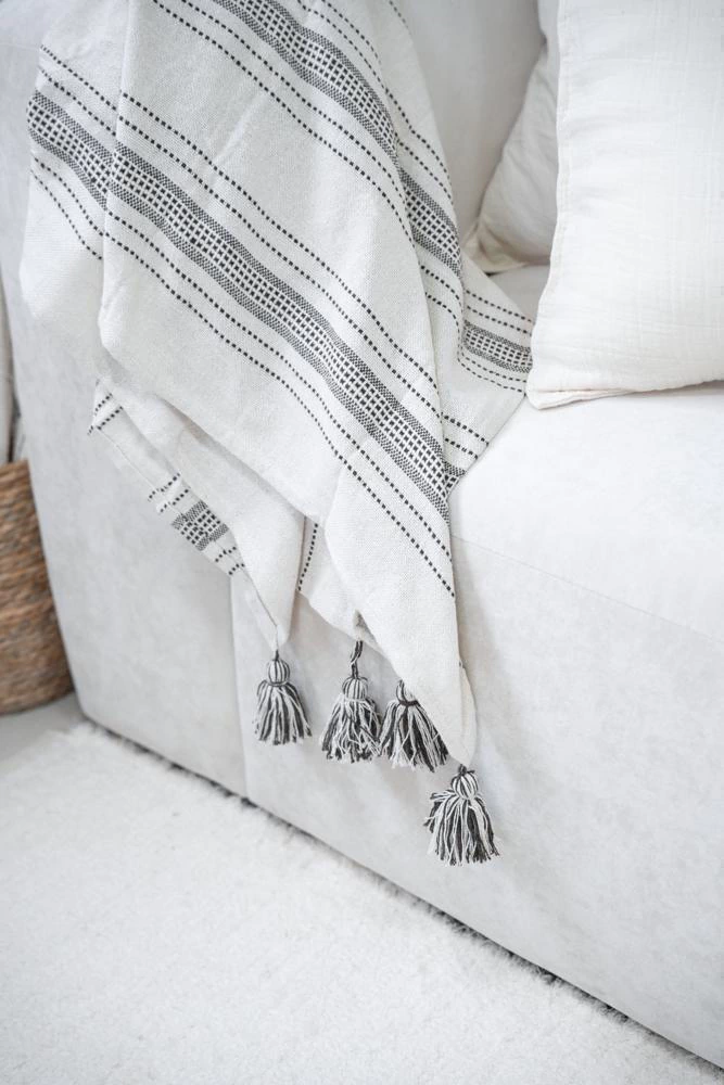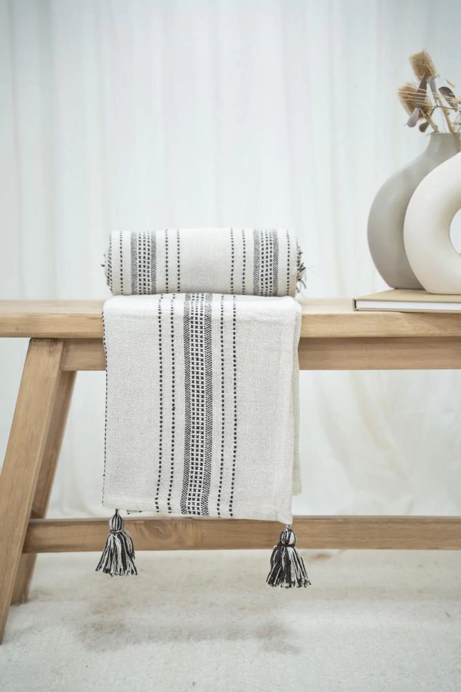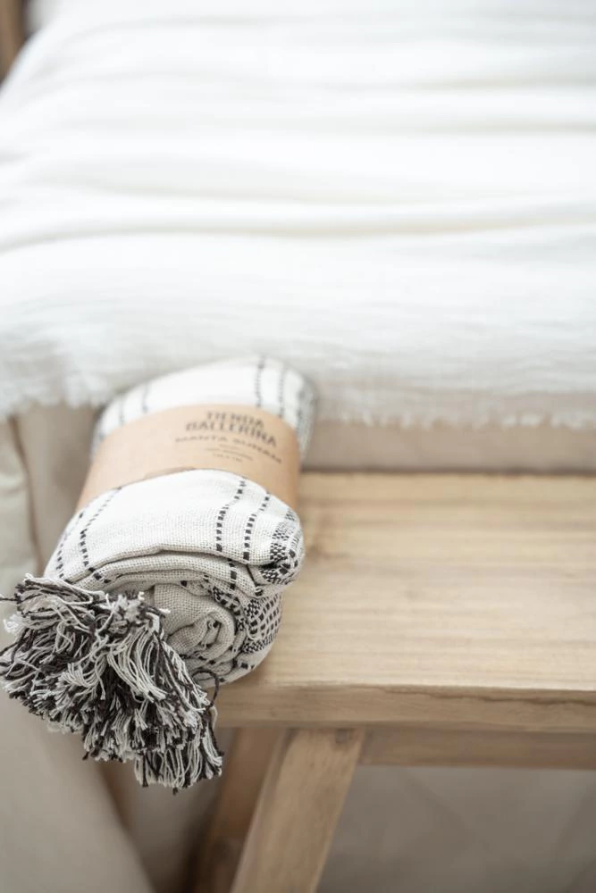 Nuestra manta SUNAM está confeccionada artesanalmente en 100% algodón natural con borlas, importada directamente de la India, cuna de las técnicas textiles más antiguas del mundo. Su diseño rústico en tonos neutros combina con cualquier estilo de decoración: boho, minimalista, nórdico o clásico.