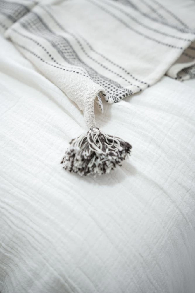 Textura suave y respirable gracias al algodón puro. Terminaciones con borlas.