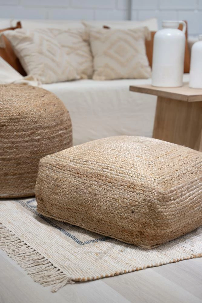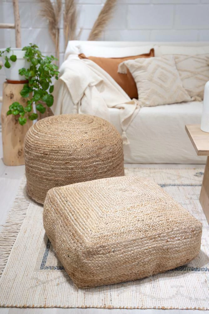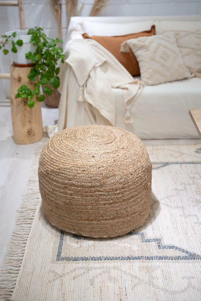 Confeccionado en yute 100% natural, este puff redondo aporta textura, calidez y un aire rústico a cualquier ambiente. Su forma suave y trenzado artesanal lo convierten en una pieza funcional y decorativa ideal para salones relajados, espacios boho o rincones de lectura.